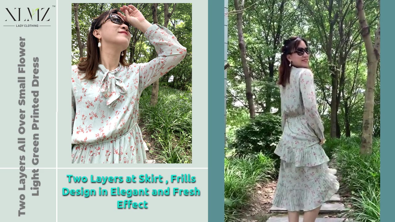 High Density Silky Effect Chiffon Fabric, frills and skirt part, strape design at neck opening, light green backside with red small flower print pattern , graceful and charming .