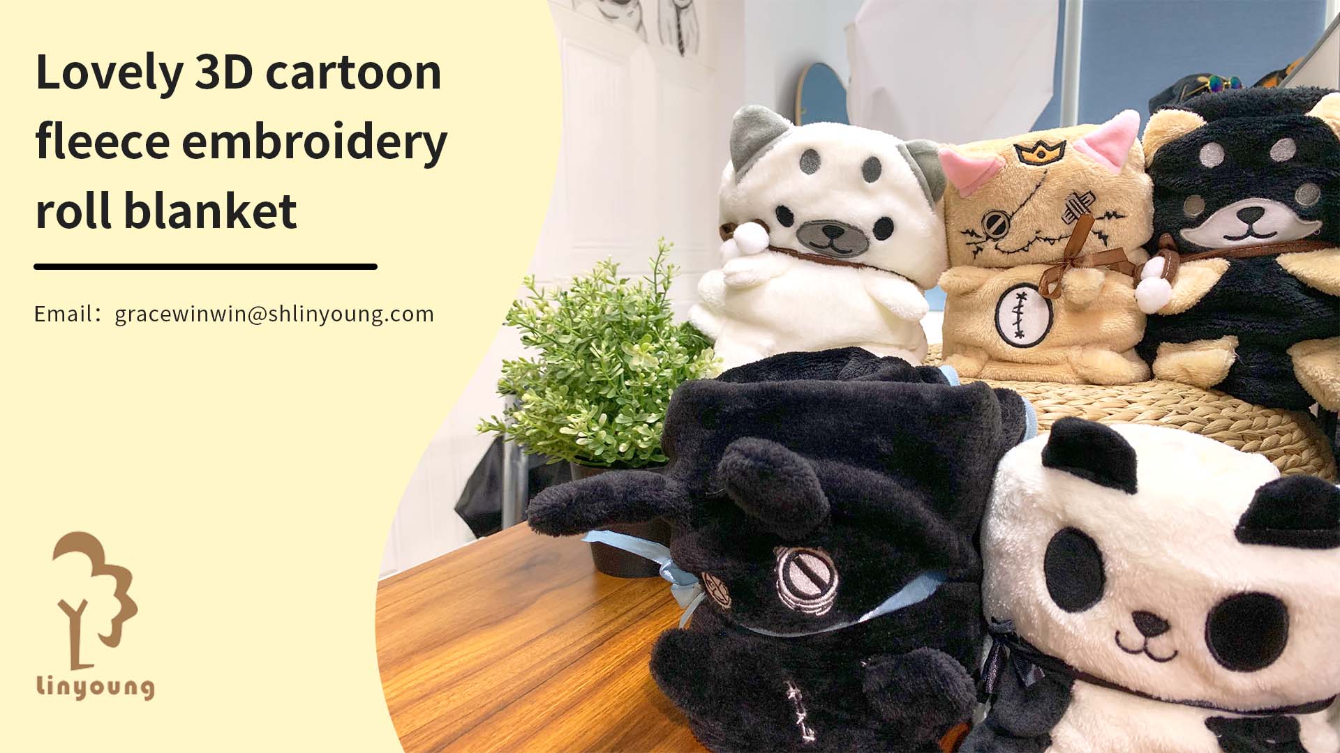 Lovely 3D cartoon fleece embroidery roll blanket.